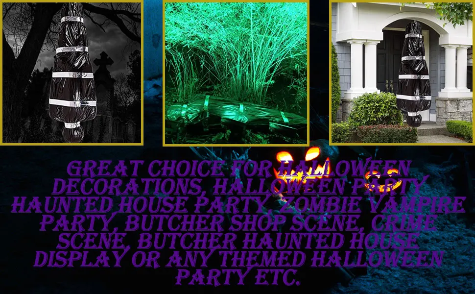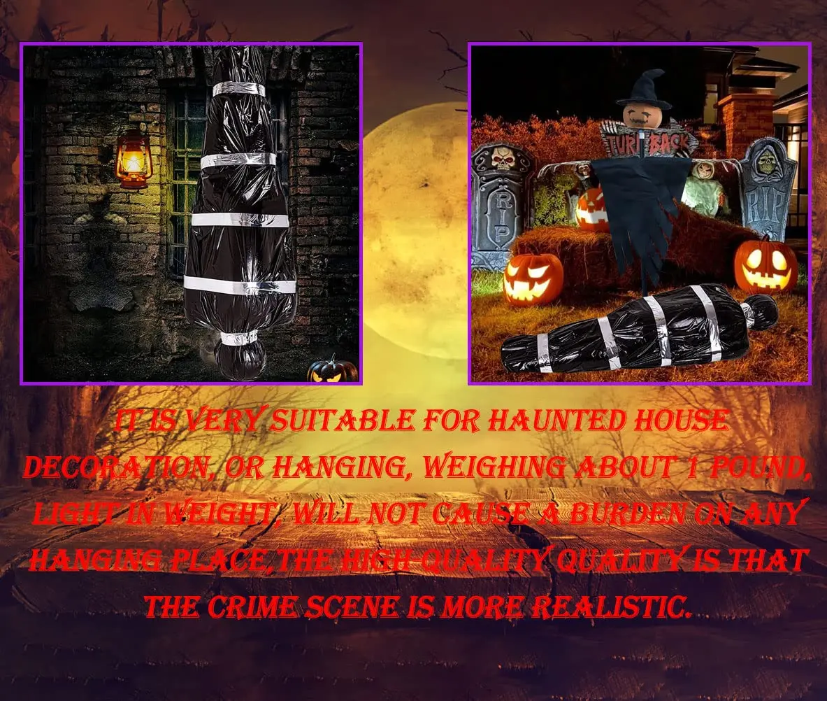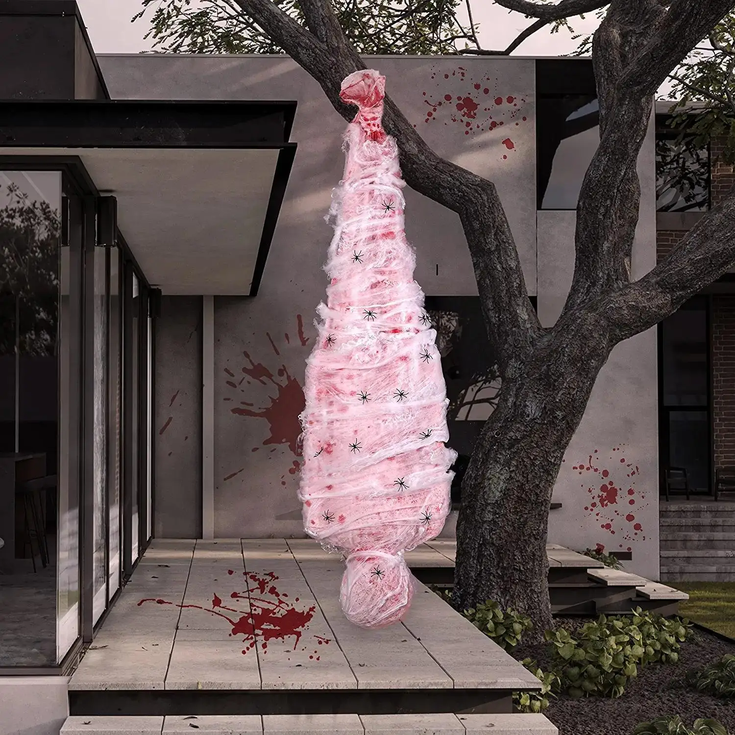 - 59inch Halloween Corpse Props Set Outdoor Yard Creepy Shroud Decoration Horror Bloody Body Bag Haunted House Hanging Decorations