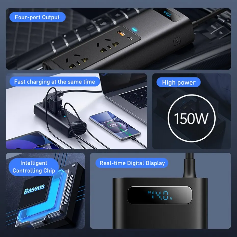 - Baseus Car Inverter 300W DC 12V to AC 220V Type-C USB Fast Charging Pure Sine Wave EU Socket for Outdoor Emergency Electricity