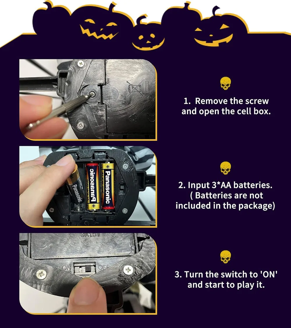 🔩 Using Steps of Halloween Prop - 1.Remove the screw and open the battery box. 2. Input 3*AA batteries. 3. Turn the switch to 'ON' and start to work.